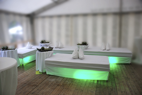Die Loungemöbel sind bestens geeignet als Cocktaillounge und werden mit einer Stretchhusse bespannt sowie mit mehreren Kissen belegt.